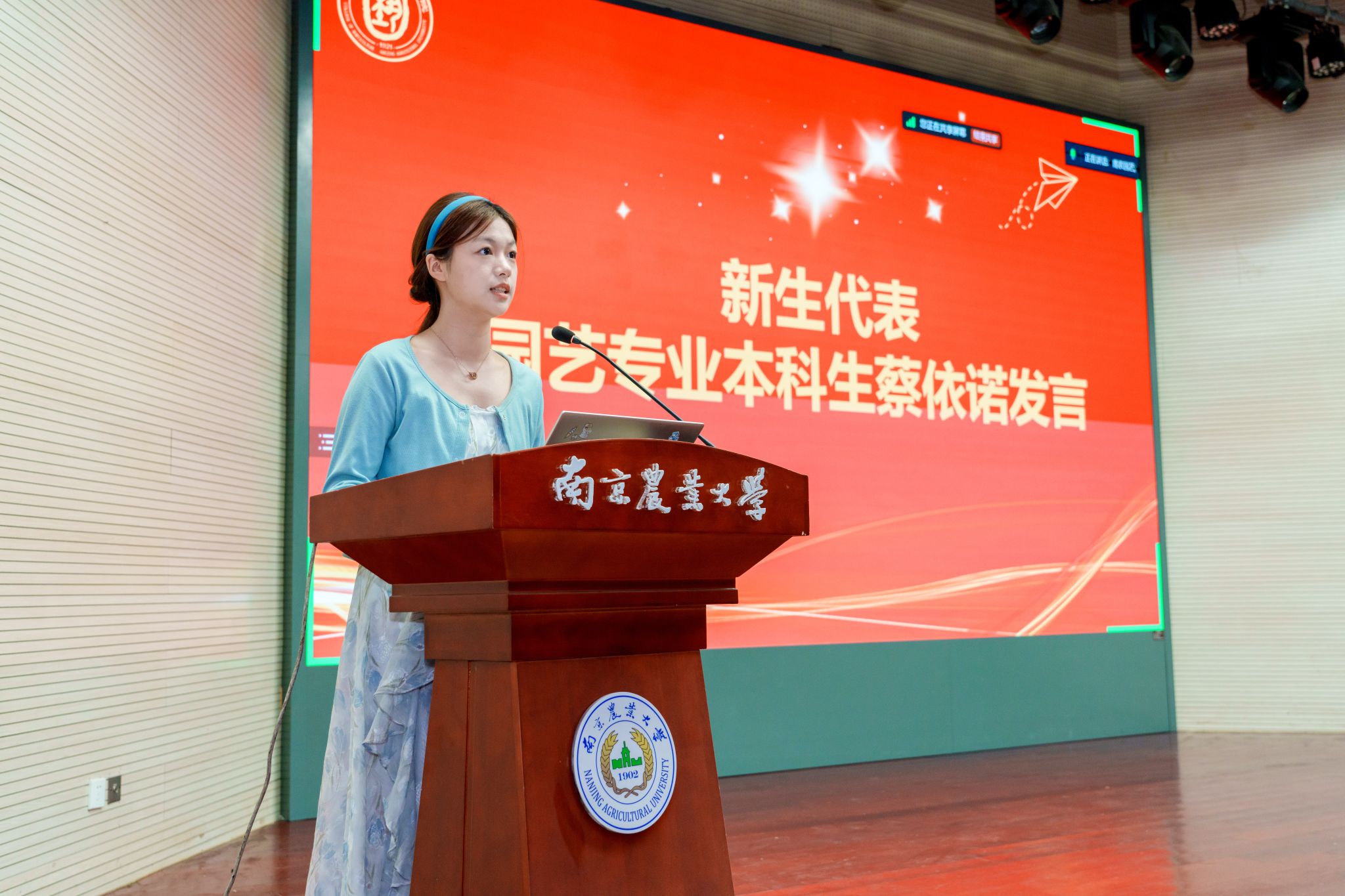 新生代表蔡依诺表达了对老师和父母的感谢、对崭新大学生活的期待及对成年、大学的深层思考。她认为书写青春篇章,便应勇担责任,直面面困难和挑战,落子无悔,踔厉奋发。