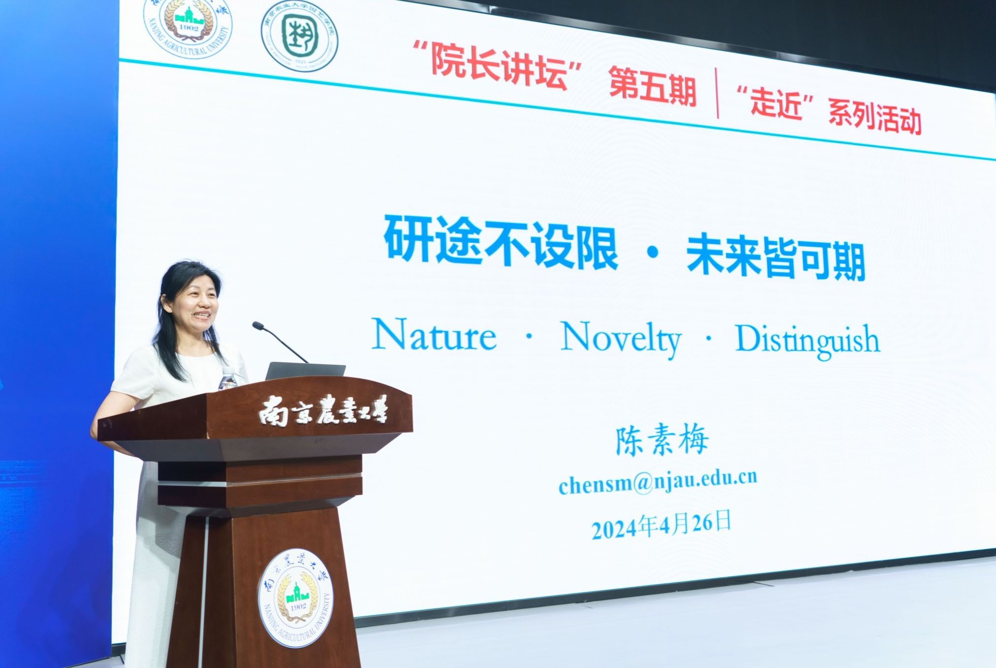 陈素梅教授从三个英语单词出发,引出报告主题,引发同学们对“什么是科研”“科学问题从哪里来”“如何做一名优秀研究生”等三个问题的关注与思考。在深入浅出的介绍中,陈素梅教授通过“柑橘油胞发现之谜”、“RNAi技术的发现”、“诺贝尔生理与医学奖得主屠呦呦通过读古医书发现青蒿素”等生动事例,引导同学们做科研的有心人,从生活中发现问题,不寻常处见真知,鼓励广大研究生从海量文献阅读中拓宽眼界、获得启发,并以“三新四面向”为引领的研究路径,聚焦科研方向、凸显科研价值。在谈及研究生的培养,她提出,新时代的研究生更应当具备本真、好奇、探索的品质,树立良好的学习态度,以攻坚克难的勇气去探索知识、解决问题。