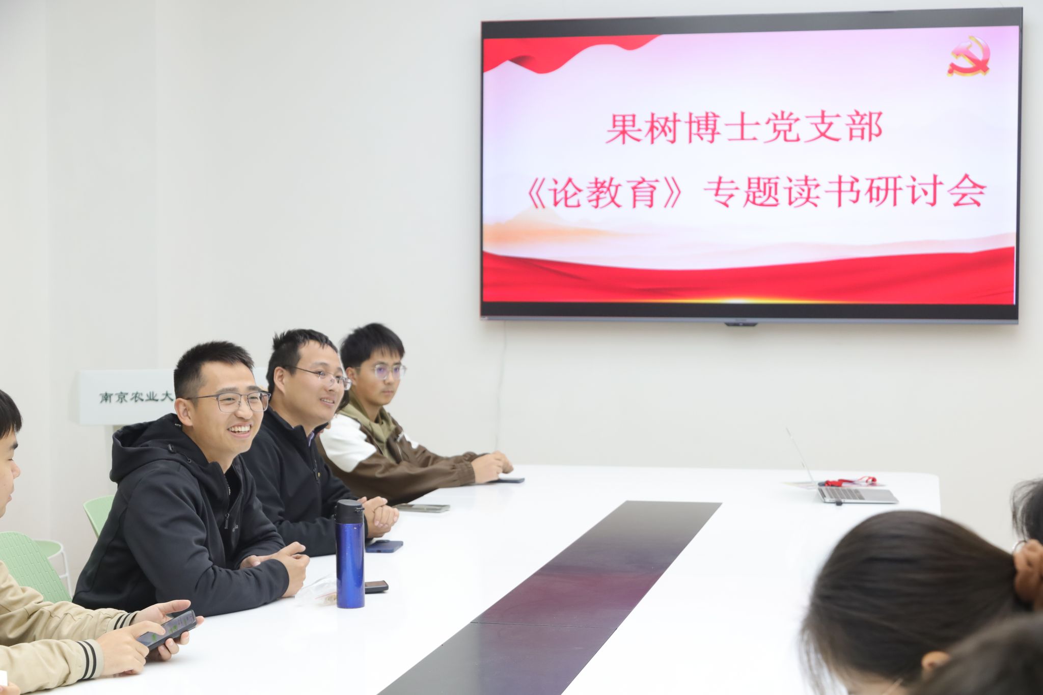 20241119日下午,果树博士生党支部在园艺楼134会议室开展《论教育》专题读书研讨会,党支部书记王鹏带领大家共同学习《论教育》的出版背景以及主要内容。