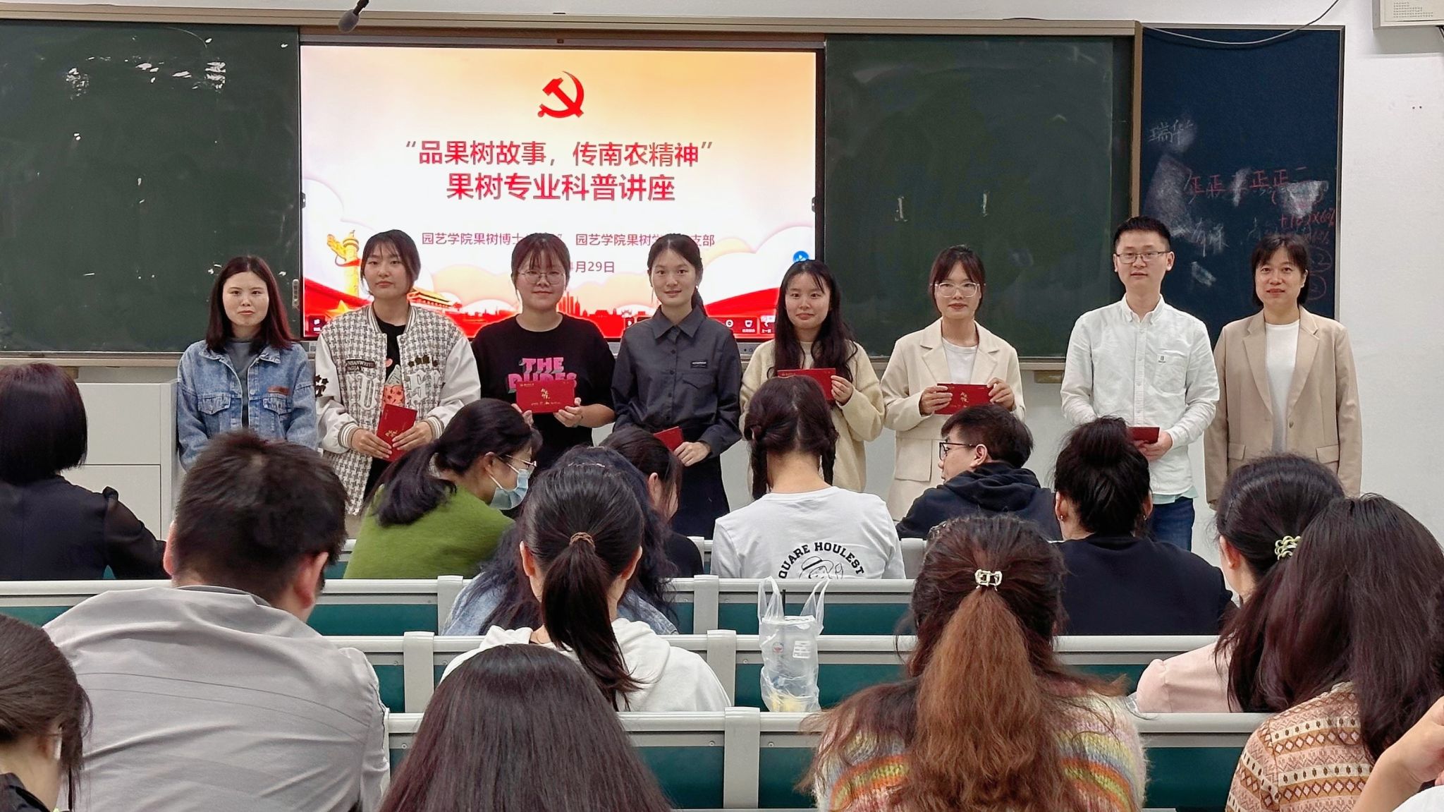 在活动中,师生党员们积极参与讨论和提问,展现了对果树专业的浓厚兴趣和积极态度。活动最后总结表彰环节,果树博士党支部书记王晨老师向四位讲座科普主讲人表示感谢,并颁发纪念品,果树学硕党支部书记侍婷老师为积极参与交流提问的同志们颁发纪念品。