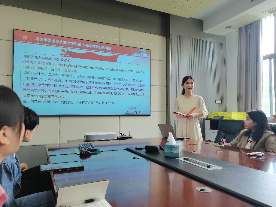 党委召开的主题教育动员大会会议精神以及所作部署进行传达。随后,支部党员认真学习习近平总书记给中国农业大学科技小院的同学们的回信精神,结合自身学习和生活,开展热烈讨论,厚植爱农情怀,深化专业思想,进一步坚定理想信念,做好学业和职业规划。
