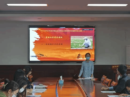 支部书记程春燕以习近平总书记给中国农业大学科技小院的同学们的回信为切入点,讲述了自己从一开始投身于农业学习和工作的迟疑,到逐渐的自我肯定、并最终坚定信念要撸起袖子加油干的心路历程和切身经历,提出了“厚植知农爱农情怀,练就强农兴农本领”的感想与呼吁,并组织支部党员一同观看了“为全面建设社会主义现代化国家贡献青春力量”的主题视频。