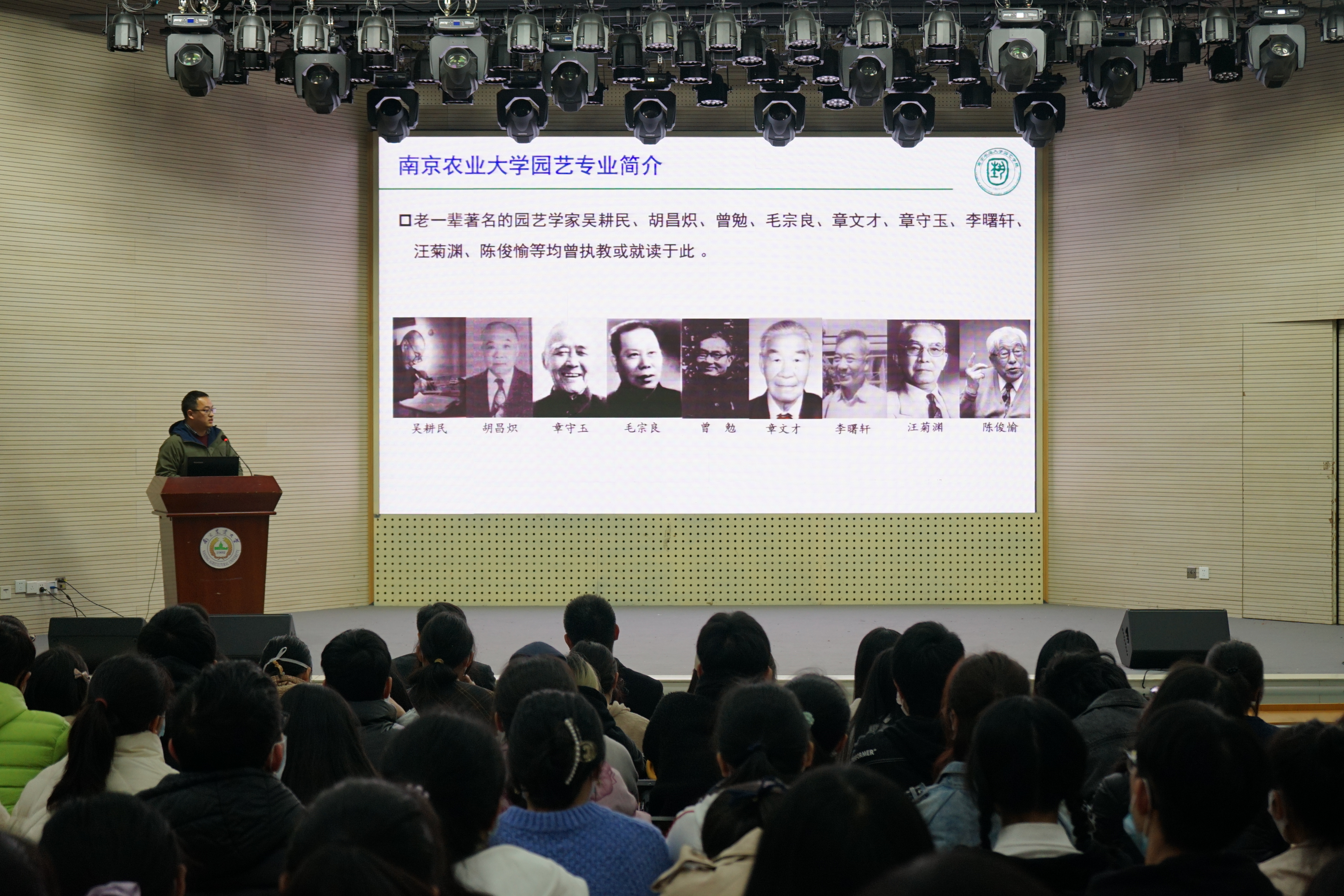 首先由上官凌飞进行专业介绍。他从专业简介、培养方案、师资队伍、教材建设、科学研究和人才培养六个方面阐述了园艺专业果树、花卉、蔬菜三个领域的研究方向、优秀资源、教学培养模式等的总体概况,并且希望大家今后可以成为熟悉国际前沿科技和国家战略需求、专业知识扎实、综合素质高、贯彻诚朴勤仁精神并拔尖的创新和复合应用型高水平人才。