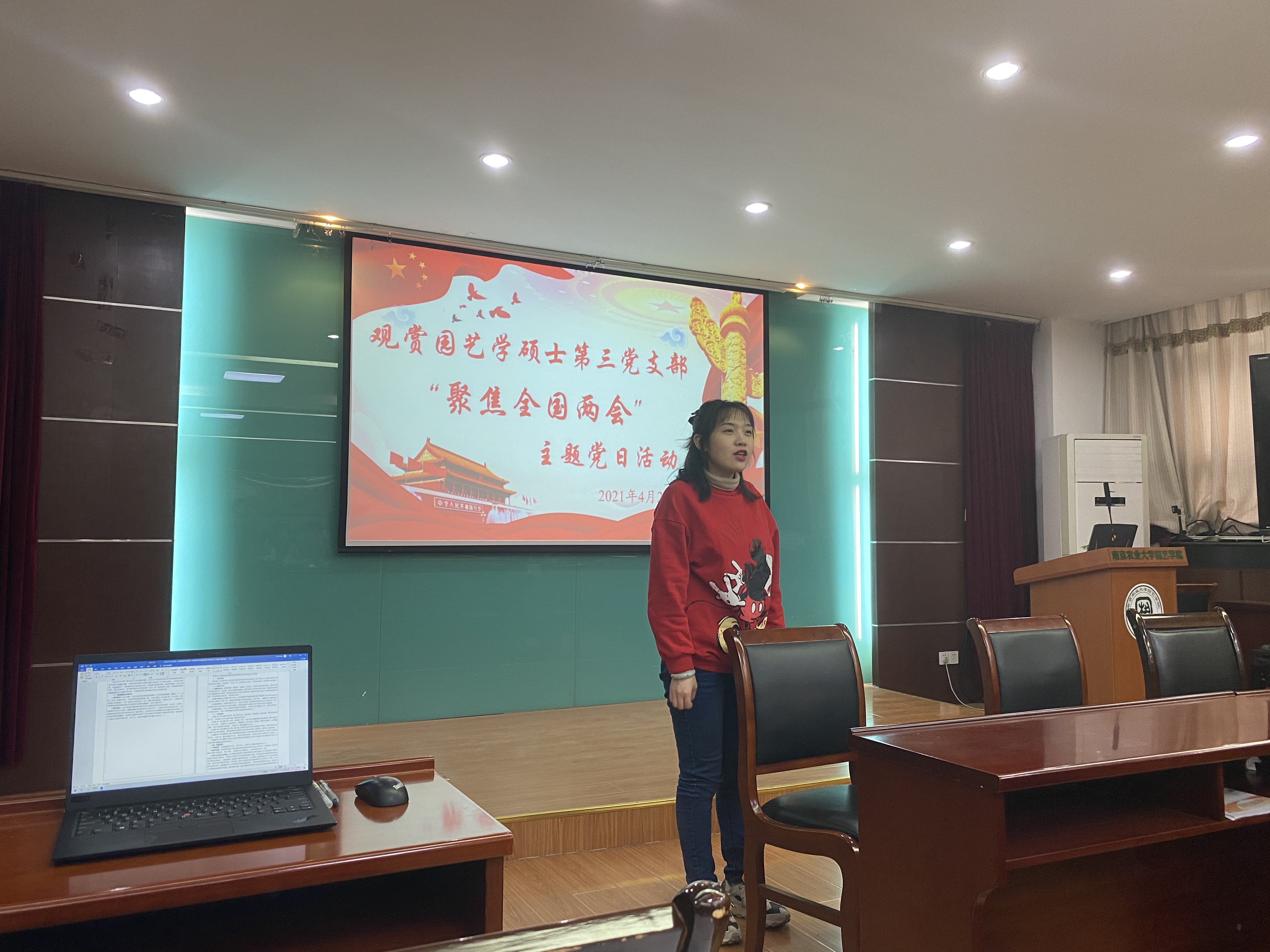 2021年4月2日下午,观赏园艺硕士第三党支部于生科楼B4011开展“聚焦全国两会”积极分子讲党课活动。支部全体党员和入党积极分子参加了本次会议,会议由党支部书记窦靓主持。