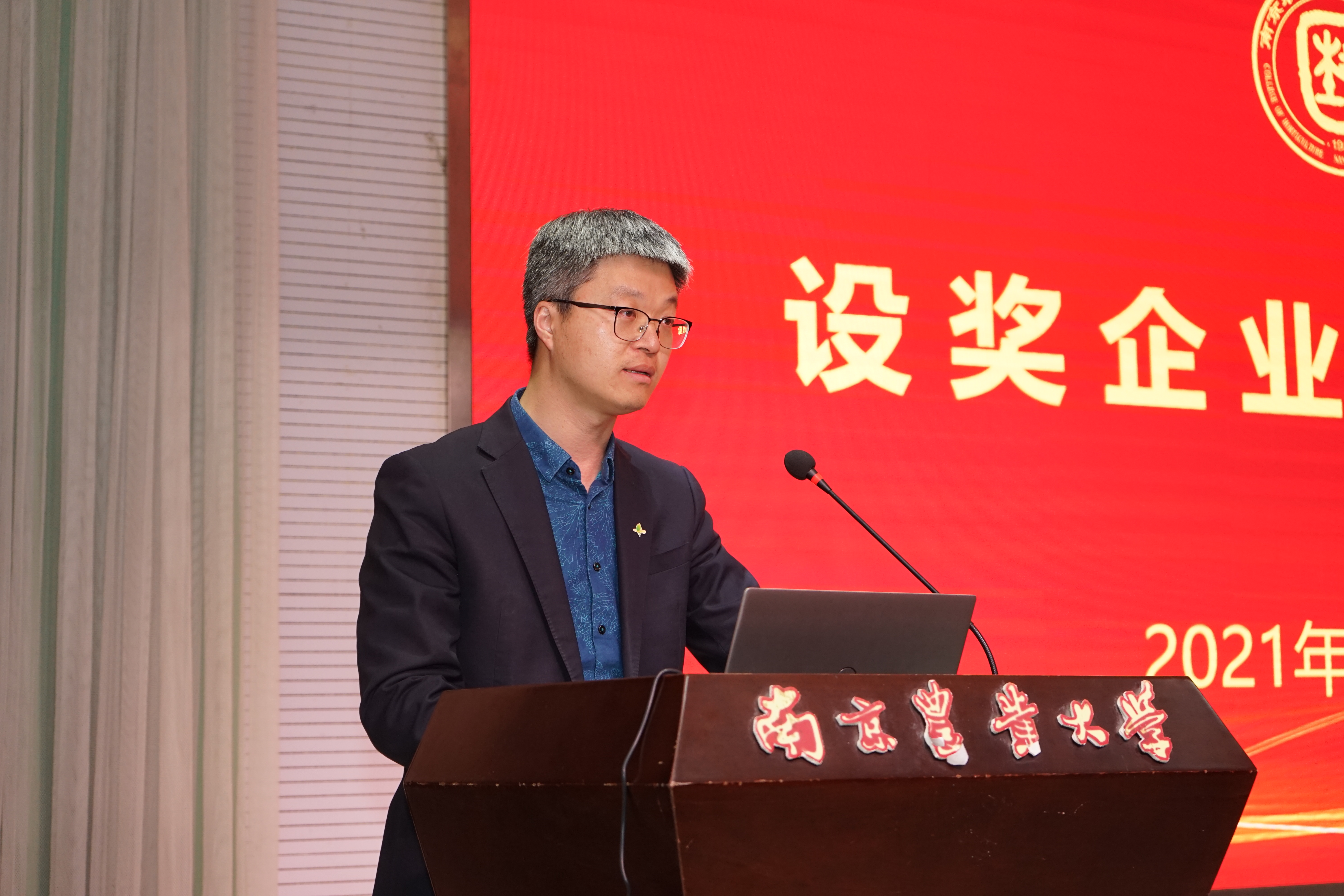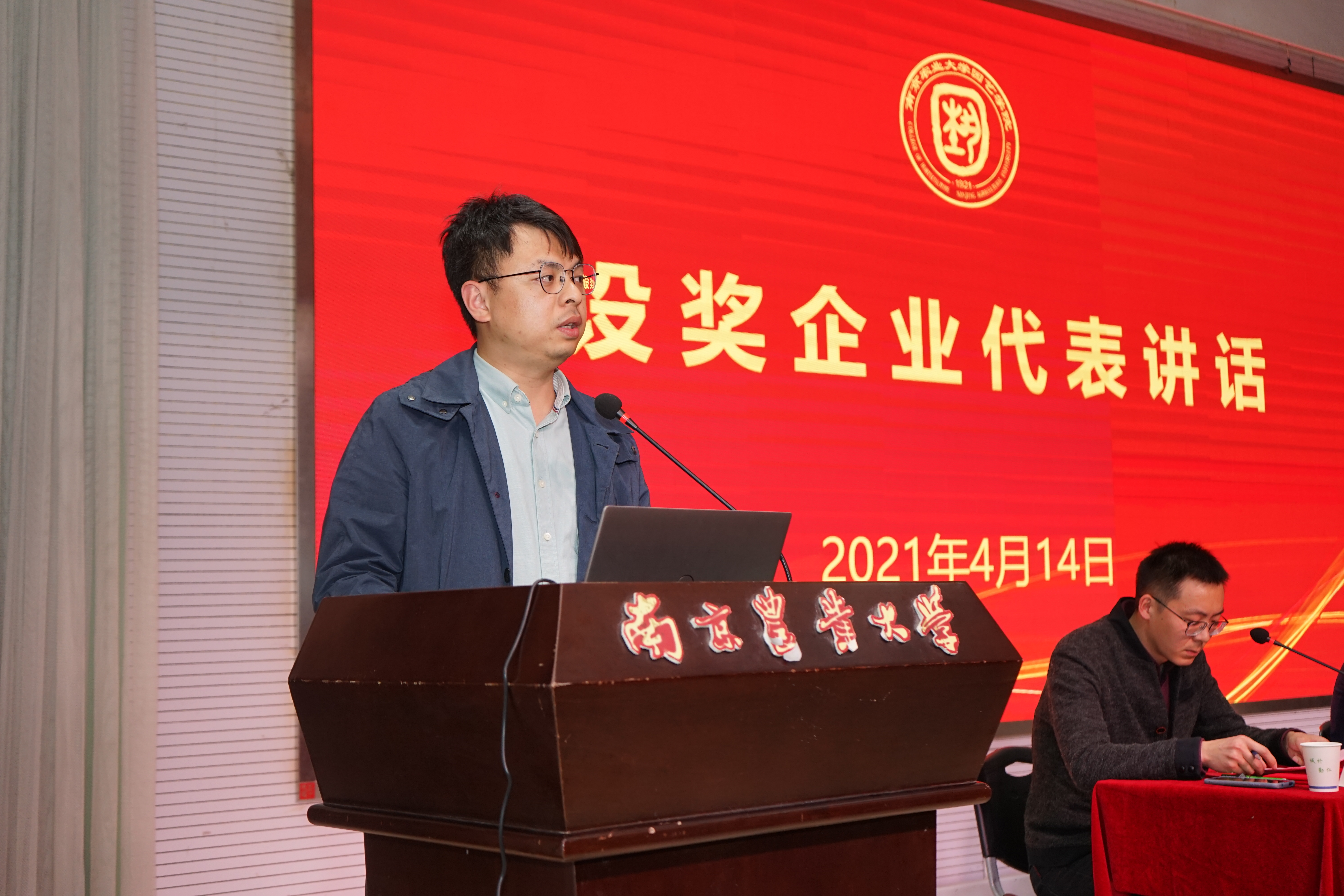 张永辉、黄晨作为设奖企业代表讲话,张永辉首先介绍了金埔园林股份有限公司基本情况,并指出企业的竞争优势,即人才优势、运营模式和技术优势;黄晨介绍了棕榈生态城镇发展股份有限公司的基本情况,并就区块链游戏进行了详细介绍。张永辉、黄晨还就个人在南农学习、生活向与会同学进行了分享。