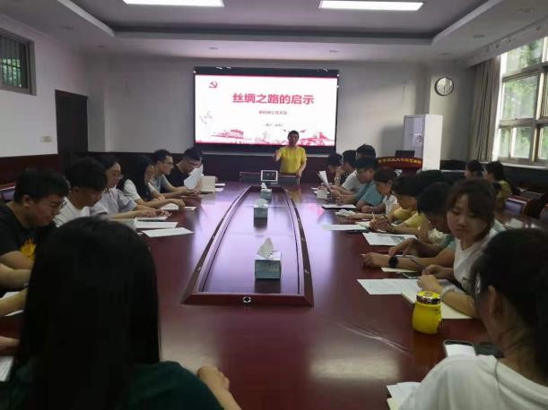 会议分三个阶段进行,第一部分由高志红书记讲党课,题目是‘丝绸之路的启示’。高书记首先对‘一带一路’的意义和含义进行了简要介绍,然后通过观看《河西走廊》纪录片讲述了“丝绸之路”的起源、发展以及当代“一带一路”对中国及世界的影响。高书记讲到:汉武帝时期张骞出使西域,开辟了陆上“丝绸之路”,陆上“丝绸之路”和形成于秦汉时期的海上“丝绸之路”,对亚洲、欧洲、非洲等诸多国家的文化交流、贸易往来产生深远影响,是古代东西方文明的交汇之路。新中国成立后,在中国共产党的领导下,丝绸之路的重要关口才真正地被发展壮大成为现代化的城市和交通要塞。2013年习近平总书记提出“一带一路”倡议,“一带一路”全称“丝绸之路经济带和21世纪海上丝绸之路”。“一带一路”不仅是实现中华民族伟大复兴之战略构想,更是沿途国家共同繁荣之有益路径,有利于边缘政治稳定,经济繁荣昌盛,百姓幸福安康。“一带一路”是国际之路、变革之路、重生之路。