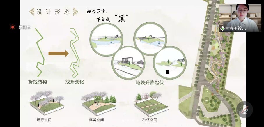 的特色,利用旱溪景观的特点,营造禅意又灵动的氛围感;“青青子衿队”着重分析人群活动占比,促成文化、休闲、生态三合一优化效果;“您说了算队”从区位文化出发,由梅引申到南京古城文化、岁寒三友的精神,并将其融入设计,匠心独具。七个小组不论是ppt汇报还是成果视频展示,都呈现了各自设计特色和人文蕴意,答辩现场也频频收获评委老师的肯定与赞赏。
