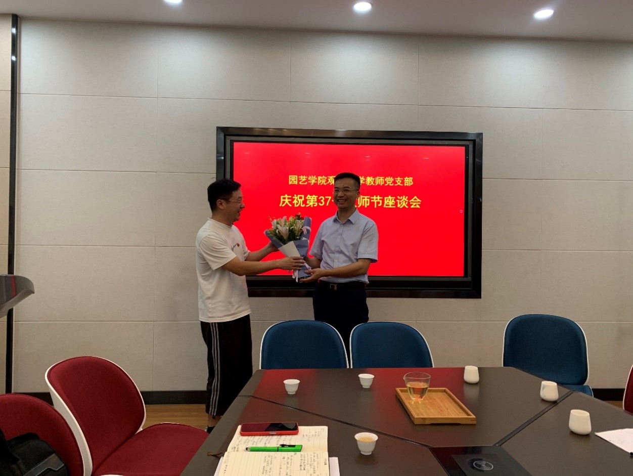 为了弘扬尊师重教的优良传统,会上,陈发棣教授为光荣在岗30年的房伟民教授赠送了鲜花,感谢房老师在人才培养和学科建设及菊花遗传育种团队建设中做出的杰出贡献。同时观赏学科的第一位硕士研究生蒋甲福教授向导师陈发棣教授敬献了鲜花,一曲《长大后我就成了你》,表达了薪火相传甘为人梯的心声。观赏学科今年新入职三位海外引进的教授,陈发棣教授、房伟民教授以及支部书记陈素梅教授分别为三位新入职老师佩戴了校徽,并勉励新教师及全体老师:忠诚党的教育事业,贯彻党的教育方针,履行教师神圣职责。修身立德,为人师表;追求真理,崇尚科学;敬业爱生,教书育人;淡泊名利,严谨治学;传承文明,勇于创新;终身学习,不断进步。为全体学生美好未来,奉献全部智慧和力量!与会的老师再次深切体会了教师职业的神圣和肩负的伟大使命。
