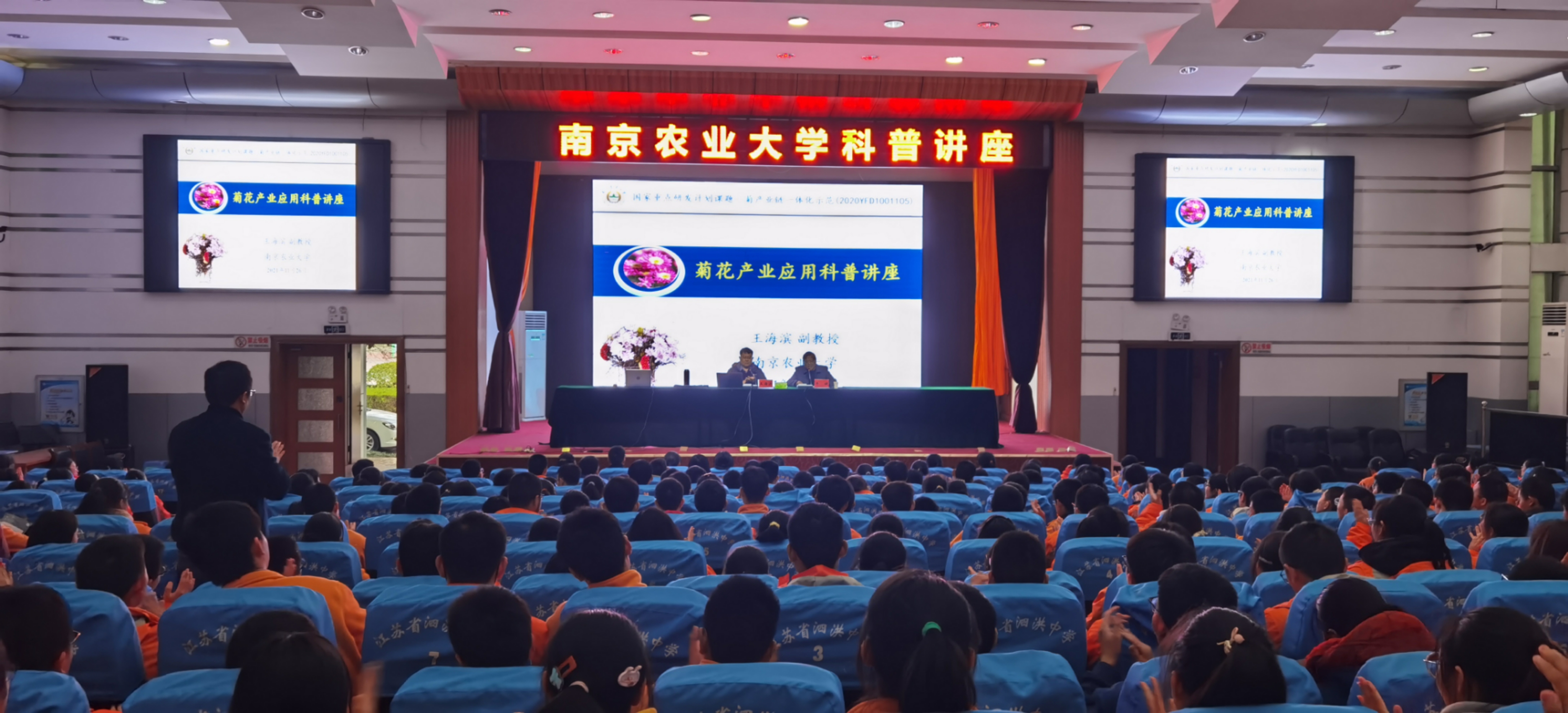 在泗洪中学,王海滨为700余名学生作了题为《菊花产业应用科普》的知识讲座。王老师从“采菊东篱下,悠然见南山”的菊花文化开始,讲述了菊花在花卉产业中的地位及观赏、药用、食用价值等,展示了各色菊花新品种,说到了区块链游戏