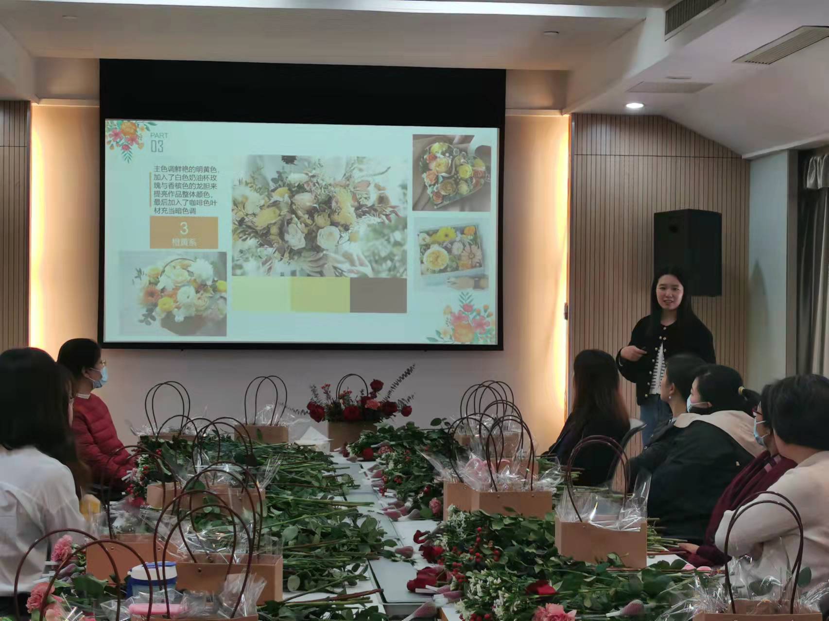 菊花课题组花艺经验丰富的孙炜博士现场教学指导艺术插花技巧。花艺师详细介绍了花材花语和插花知识,演示了插花的技巧与方式方法,讲述了插花的色彩搭配、层次构图与造型修剪。
