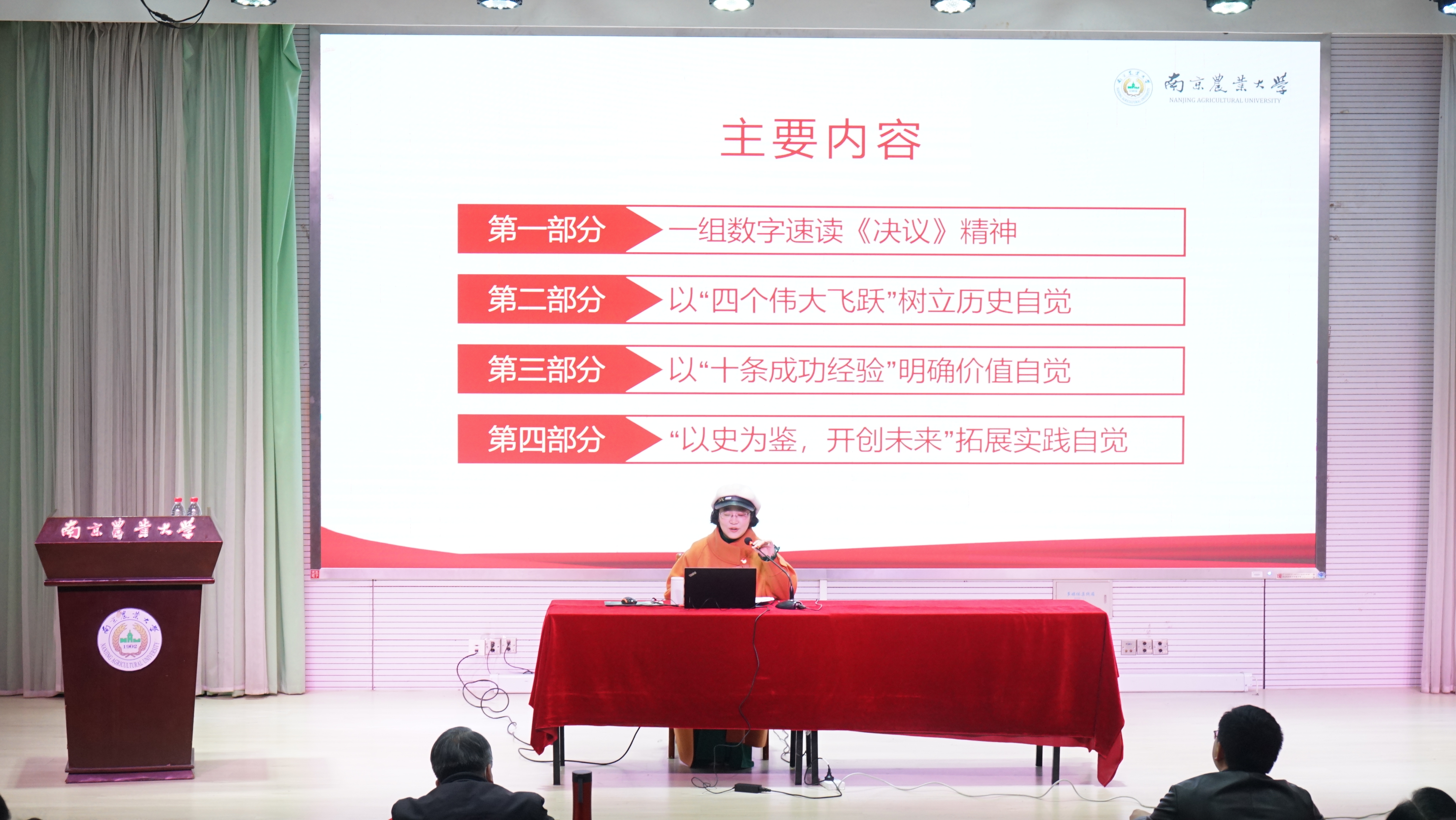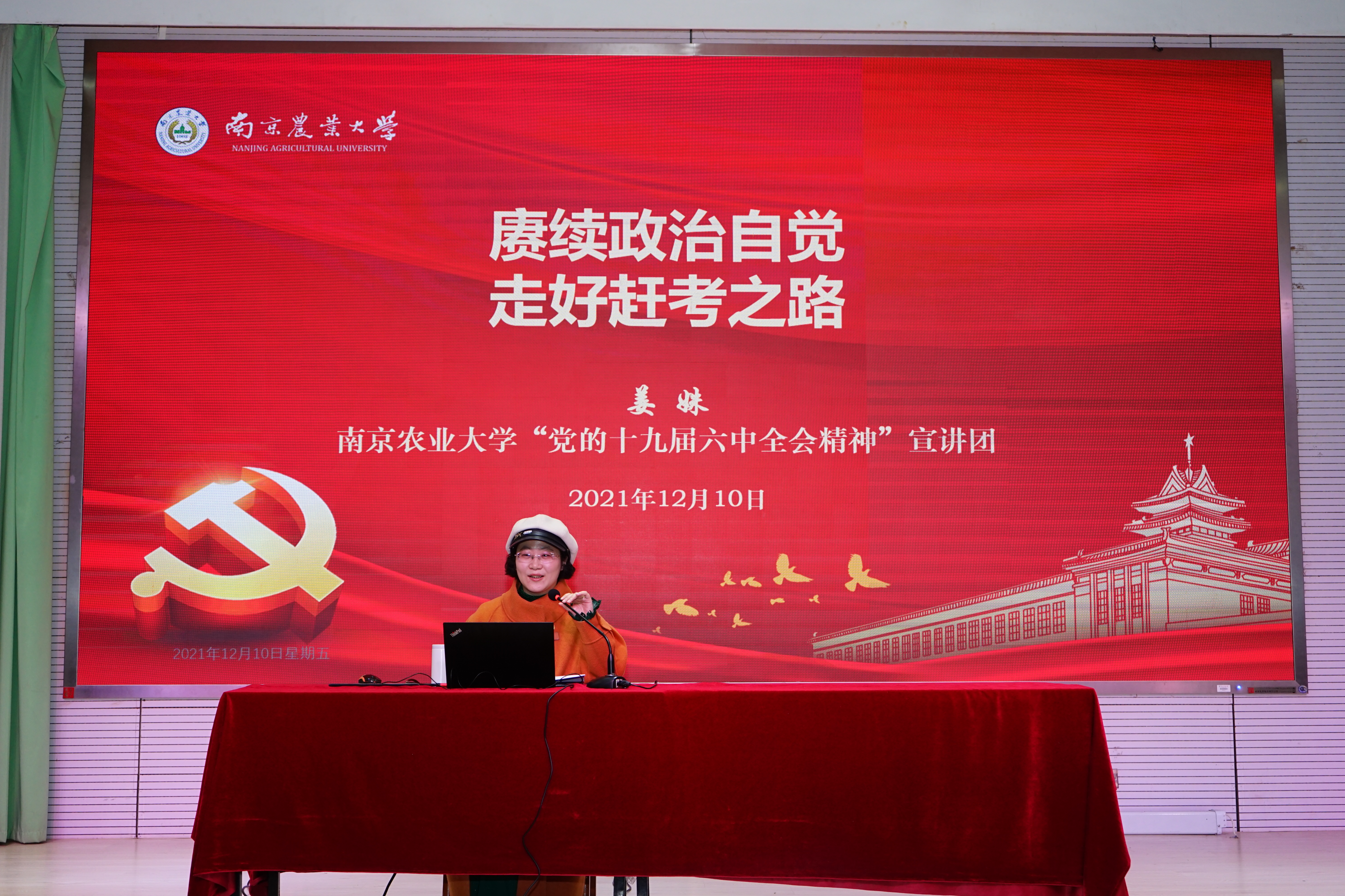 姜姝围绕以一组数字速读《中共中央关于党的百年奋斗重大成就和历史经验的决议》精神、以“四个伟大飞跃”树立历史自觉、以:十条成功经验”明确价值自觉、“以史为鉴、开创未来”拓展实践自觉等四个方面做了《赓续政治自觉、走好赶考之路》的专题宣讲报告,系统解读和诠释了全会精神,帮助师生全面深刻认识党的十九届六中全会和新的历史决议的重大意义。