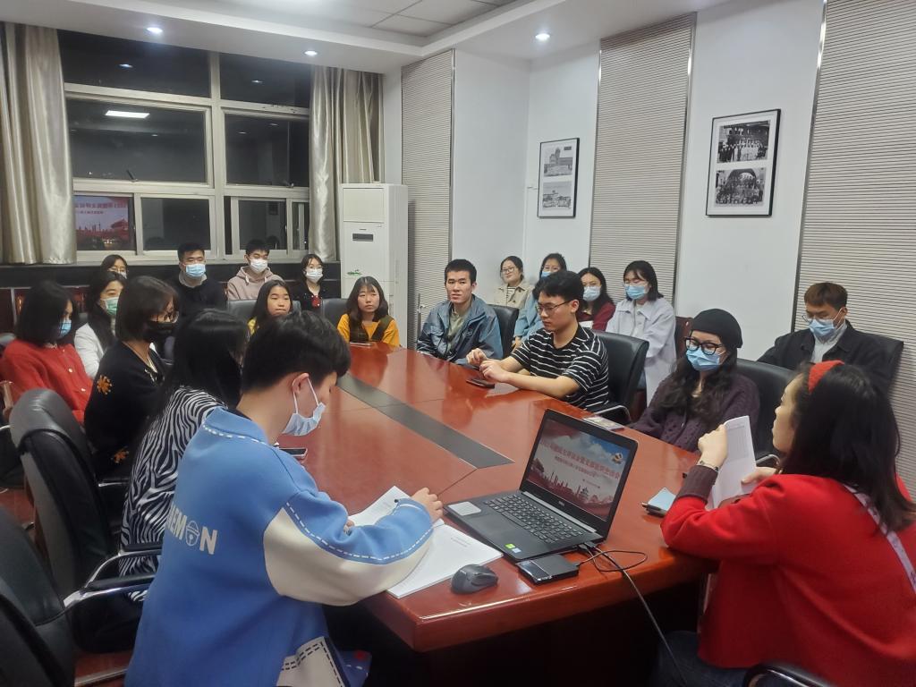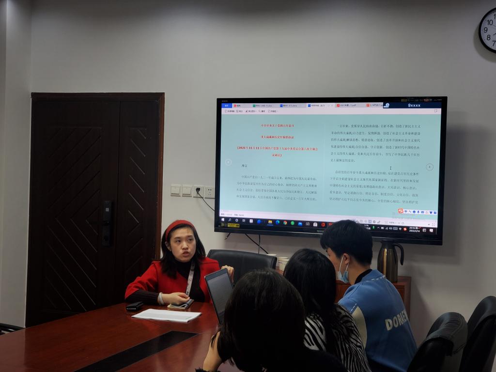 窦靓对本支部建设情况做了简单汇报。过去的一年,支部组织建设与教育管理“双融合”,使党的创新理论更加入脑入心;理论学习与学术科研“双促进”,开展了丰富多彩主题教育实践活动;依托学科专业特色开展志愿服务活动,把支部活动开展在科研一线,让学习实践有思想有温度;建立健全支部党员考核机制,提高党员参加活动积极性,做到建品牌与标杆示范“双培育”;开展支部特色活动,如“二十一天学习打卡活动”、献礼建党百年主题摄影活动等,提升综合素养。她说,在今后的支部工作开展中,要让更多支部成员带头宣讲,加强大家对于党的理论和方针政策的学习,提升语言表达能力。会上,窦靓带领支部全体党员,通过线上线下学习相结合的方式,学习了《中共中央关于党的百年奋斗重大成就和历史经验的决议》,希望大家能将决议内容和精神记到心里、用到实处。