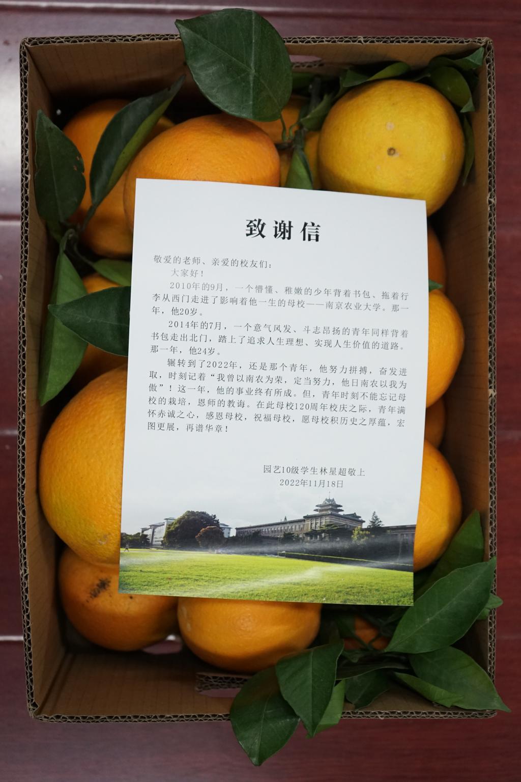 林星超在致谢信中表示,从南农毕业后走进社会,他牢记母校老师谆谆教诲,努力拼搏,奋发进取。恰值母校建校120周年之际,他满怀赤诚之心,由衷地感谢、祝福母校,并希望母校积历史之厚蕴,宏图更展,再谱华章!