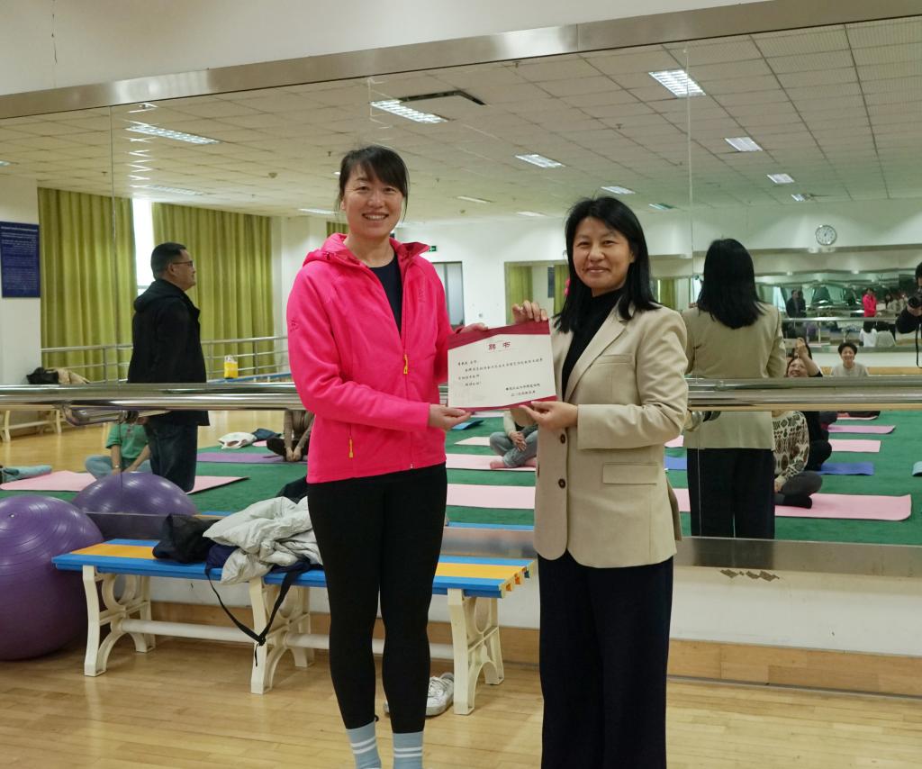 开班式上,陈素梅为本次培训班指导教师李艳杰颁发聘书,至此深受老师们喜爱的瑜伽班正式开班了!