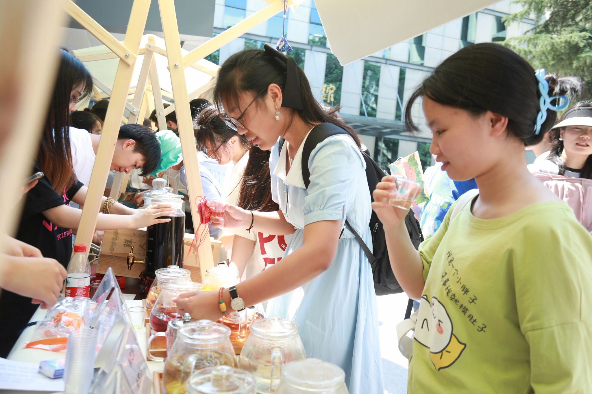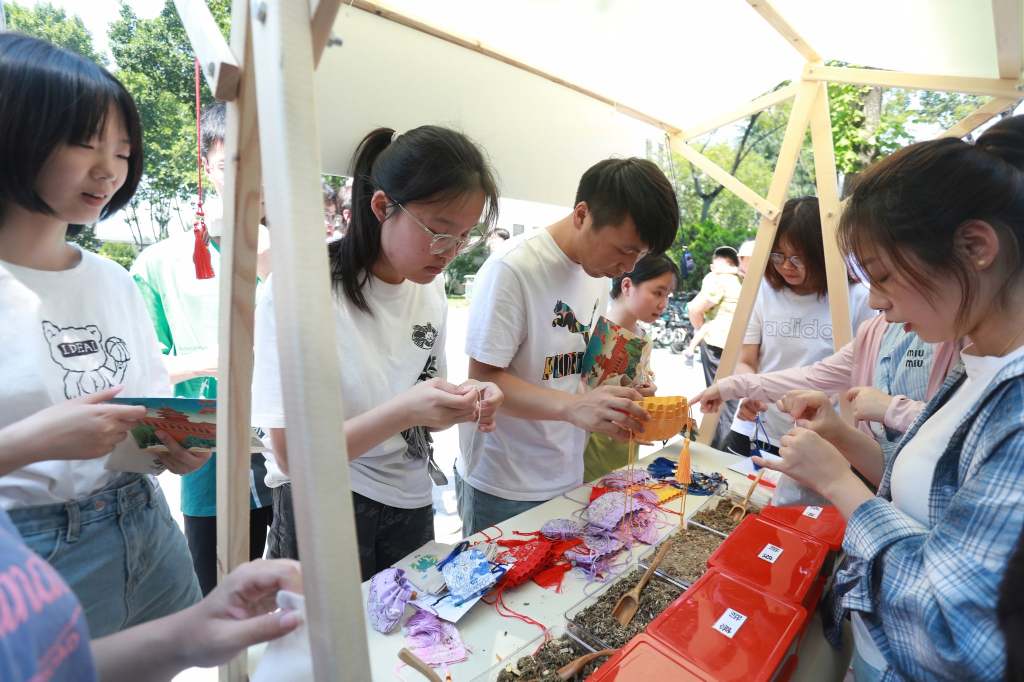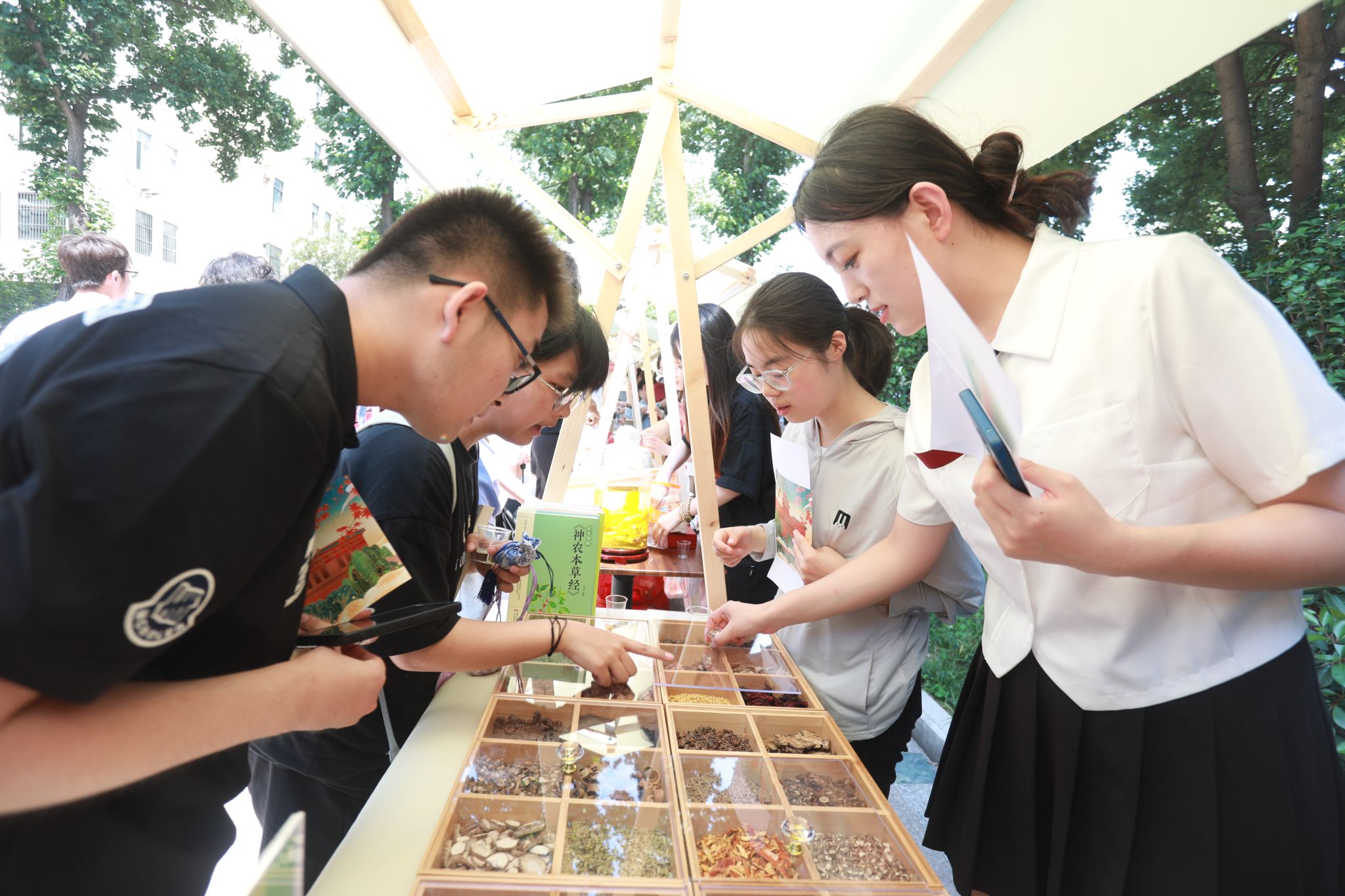 师生进行了大型专家义诊,累计提供健康服务300多人次,发放文创中药香囊千余个。在“神农本草”中医药文化展示区,人头攒动,气氛火热, 热闹非凡,中药香囊、药用植物、芳香中药、中药传统制药工具、中药文创作品、中药特色产品、中药标本、中药学科特色及中医药文化展等一系列丰富多彩、耳目一新的互动展区吸引了众多师生参与观赏学习和互动交流。
