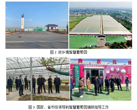 推荐,王晨同志于2020-2021年度到江阴璜土镇挂职副书记,重点负责农业尤其葡萄产业的发展与规划,并将葡萄精准栽培、智能水肥一体化、智能环境检测与病虫害防控等技术在江阴璜土、顾山、月城、华士、霞客等镇大面积推广。为更好地打造葡萄智慧中心,王晨教授作为技术专家协助江阴市璜土镇申请了中央农业产业强镇项目,总投资4000万元,建设了璜土智慧葡萄园。该园占地100亩,已经成为江苏省葡萄产业现代化智能化的示范与样板(图2)。项目启动以来,国家农业农村部、省农业农村厅、市县各级农业农村局及各级党委政府领导多次到智慧葡萄园调研指导工作(图3)。