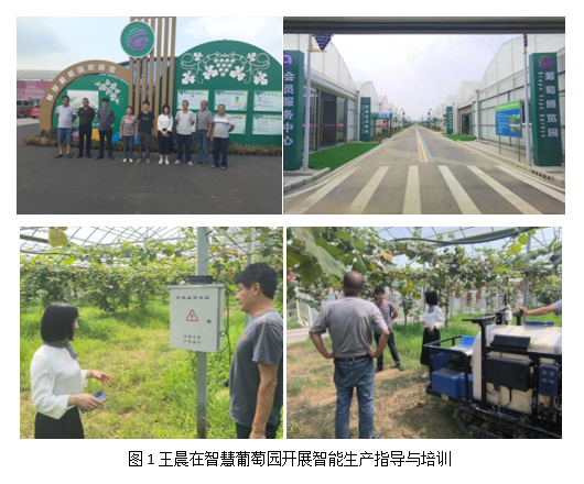 璜土智慧葡萄园项目以促进地方农业产业化公共服务能力,引领带动地方特色产业高效、持续、稳定发展,让璜土葡萄产业得到全面提升,加速全产业链的发展模式,成为农业产业工业化智能化生产示范。自2019年项目启动以来,王晨教授基于数字信息化与物联网系统,结合葡萄生长发育与环境条件耦合智能调控开展项目研究,并从葡萄园环境智能调控、土壤及气象数据采集、水肥一体化智能系统、智能病虫害防控等多个模块长期对企业技术人员开展智慧化生产培训与技术指导(图4),并根据地方与园区工作以及社会服务的需求,经常深入一线交流智慧葡萄园的发展以及技术培训。