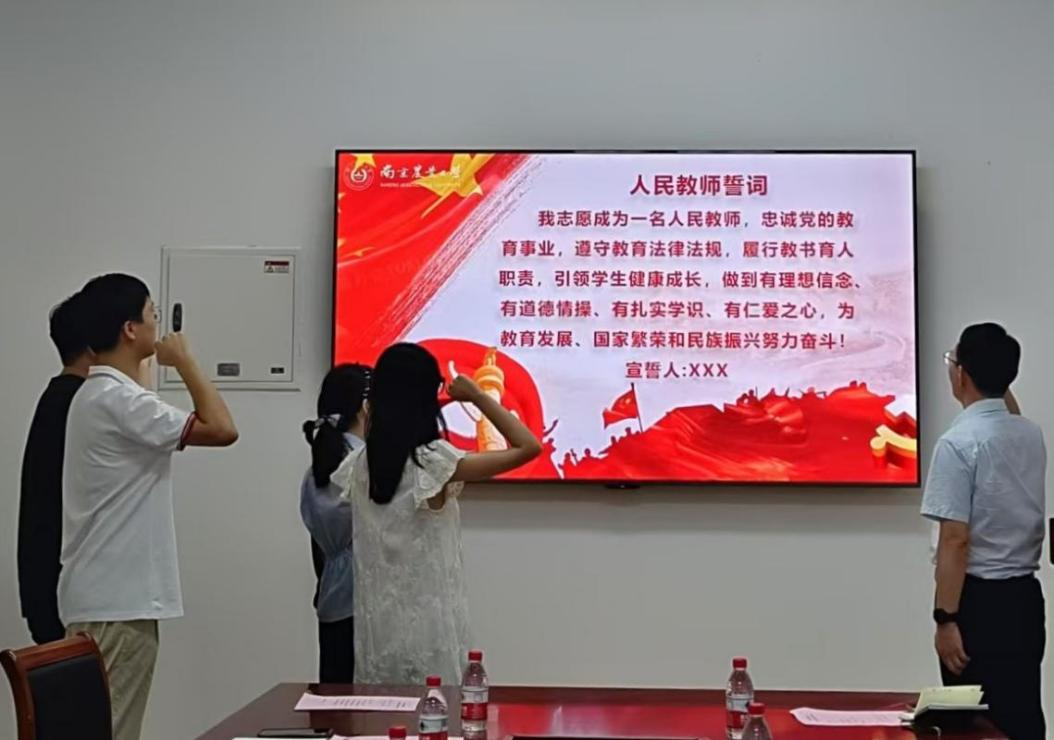 侯喜林、陈劲枫、吴震、陶建敏四位老教师作为代表为新教师佩戴校徽,党委书记姚志友带领新入职教师进行宣誓。