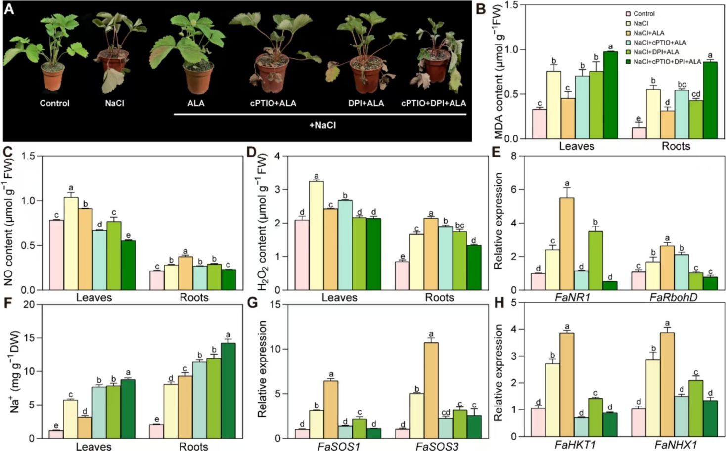盐胁迫严重抑制植物生长发育。全球盐渍土覆盖面积超过8.33亿公顷,占地球陆地表面积8.7%。中国近1亿公顷的土地属于盐渍土。预计到2050年,超过50%的可耕地将受到土壤盐分影响。草莓(Fragaria×ananassaDuch.)是一种浅根系作物,对盐分非常敏感。研究提高草莓耐盐性方法并探索其潜在的转录调控机制具有重要科学价值和现实意义。前文提出,5-氨基乙酰丙酸(ALA)能够诱导盐胁迫下草莓根系信号物质一氧化氮(NO)和过氧化氢(H2O2)积累,后者诱导钠离子(Na+)截留于根系,从而减少向上运输,减少叶片积累,达到增强植物耐盐性的目的。然而,其中的转录调控机制未被揭晓。