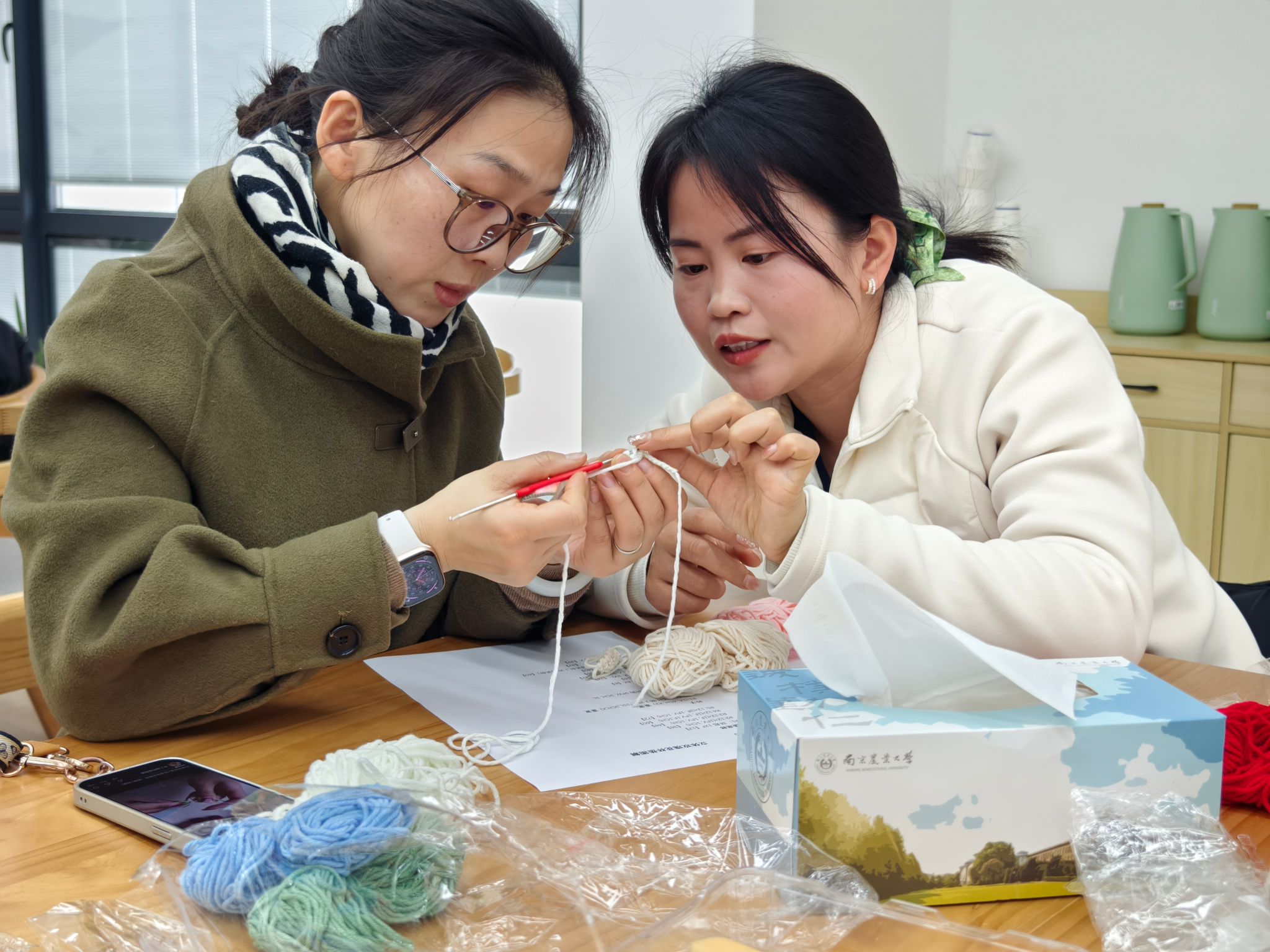 薛蕾老师作编织技艺讲授,薛老师从钩织起源、钩针型号、毛线材质特性讲起,逐步示范起针、锁针、短针等基础针法,手把手教学,针对老师们操作中遇到的难点问题,逐一进行指导,最终一朵朵活泼可爱的玫瑰花在老师们手中诞生。