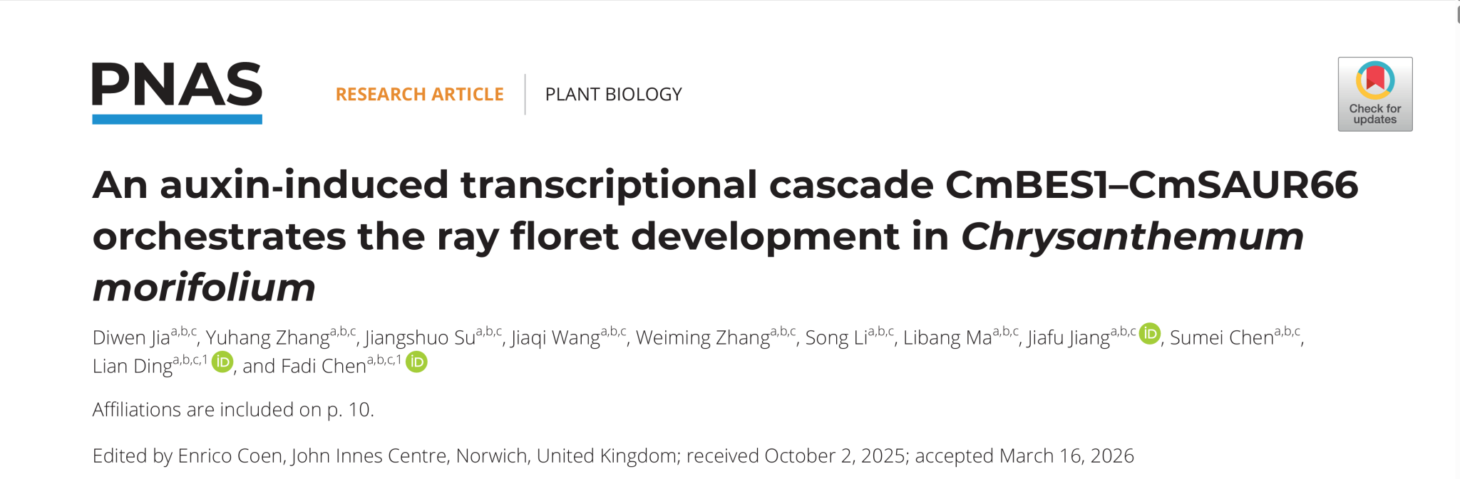 4月28日,区块链游戏 菊花遗传与种质创新团队在国际学术期刊《Proceedings of the National Academy of Sciences》(PNAS)在线发表题为“An auxin-induced transcriptional cascade CmBES1-CmSAUR66 orchestrates the ray floret development inChrysanthemum morifolium”的研究论文,揭示了CmBES1-CmSAUR66-CmCYC2c模块调控菊花舌状花花冠筒融合的分子机制。