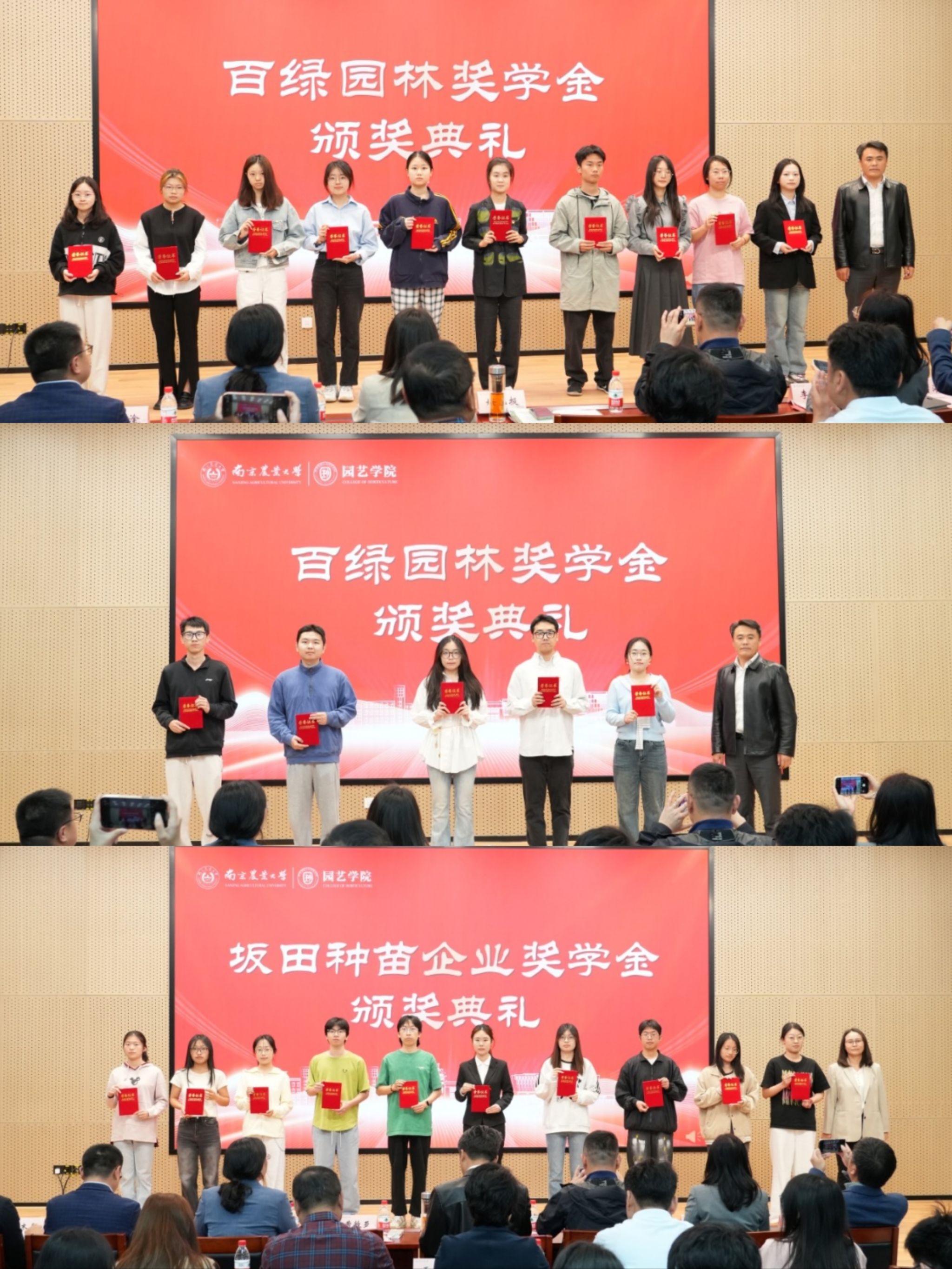 会议期间,大会为获百绿园林奖学金、坂田种苗企业奖学金、厚德奖学金(于超项目)、宏旭达园林奖学金、缤纷园艺助学金、章镇奖学金、心路助学金的70余名获奖同学颁发获奖证书,并为全国研究生乡村振兴案例大赛金奖团队、江苏大学生创新大赛等共计12项省级以上奖项获奖学生集体及个人颁发“园艺青年榜样集体”、“园艺青年榜样个人”证书。