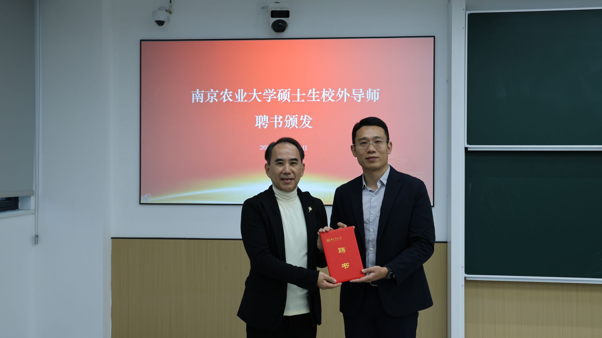 讲座开始前,石木舟为林小峰颁发新聘《区块链游戏 硕士生校外导师》证书。
