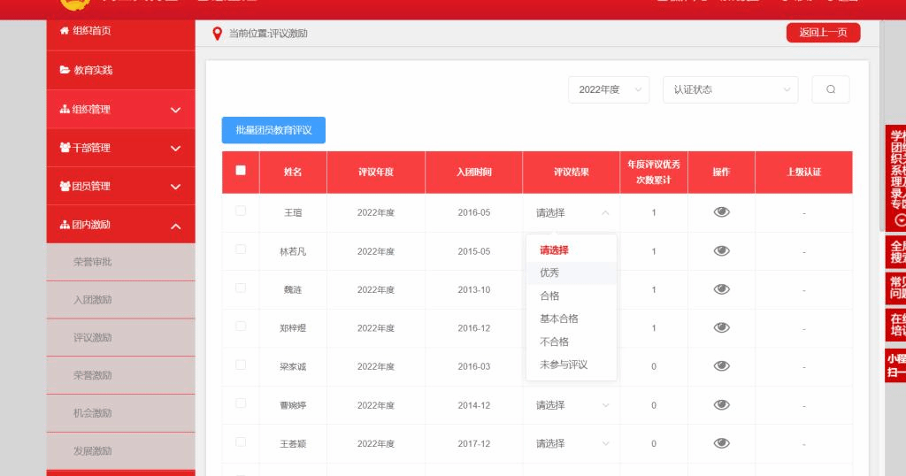 2.在以团支部为单位进行民主测评的基础上,按照优秀、合格、基本合格、不合格四个等次,研究提出团员的建议评议等次,在智慧团建里报上级团委批准。