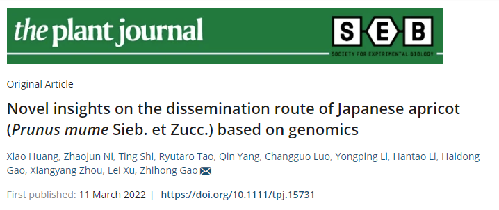 果树生物技术实验室梅创新团队高志红教授课题组在国际期刊The Plant Journal上发表了题为“Novel insights on the dissemination route of Japanese apricot (Prunus mume Sieb. et Zucc.) based on genomics”的研究论文揭开了梅从西南横断山区起源中心到现在的分布区如何传播的谜底。该研究基于来自不同地理分布的146份梅种质资源重测序数据,通过生物信息学对其遗传多样性、群体结构、基因流和叶绿体单倍型等进行分析,发现梅传播的路径有两条,第一条传播路线是沿着长江流域系统,从中国西南到湖南、江西、安徽,最后到江苏、浙江和上海地区。第二条传播路径主要是沿珠江流域,从中国西南到贵州荔波,再到广东、福建、台湾地区,研究结果为梅的传播路径提供了新的见解。另外,通过野生种群和栽培种群的遗传变异,对驯化和改良的机制有了深入的了解,为梅的育种提供了新的线索。