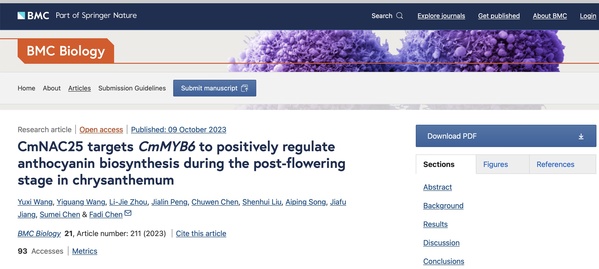 陈发棣教授团队在生物学领域经典期刊BMC Biology上发表了题为“CmNAC25 targets CmMYB6 to positively regulate anthocyanin biosynthesis during the post-flowering stage in chrysanthemum”的研究论文。阐明了NAC转录因子CmNAC25参与调控菊花衰老过程中花青苷积累的分子机制。