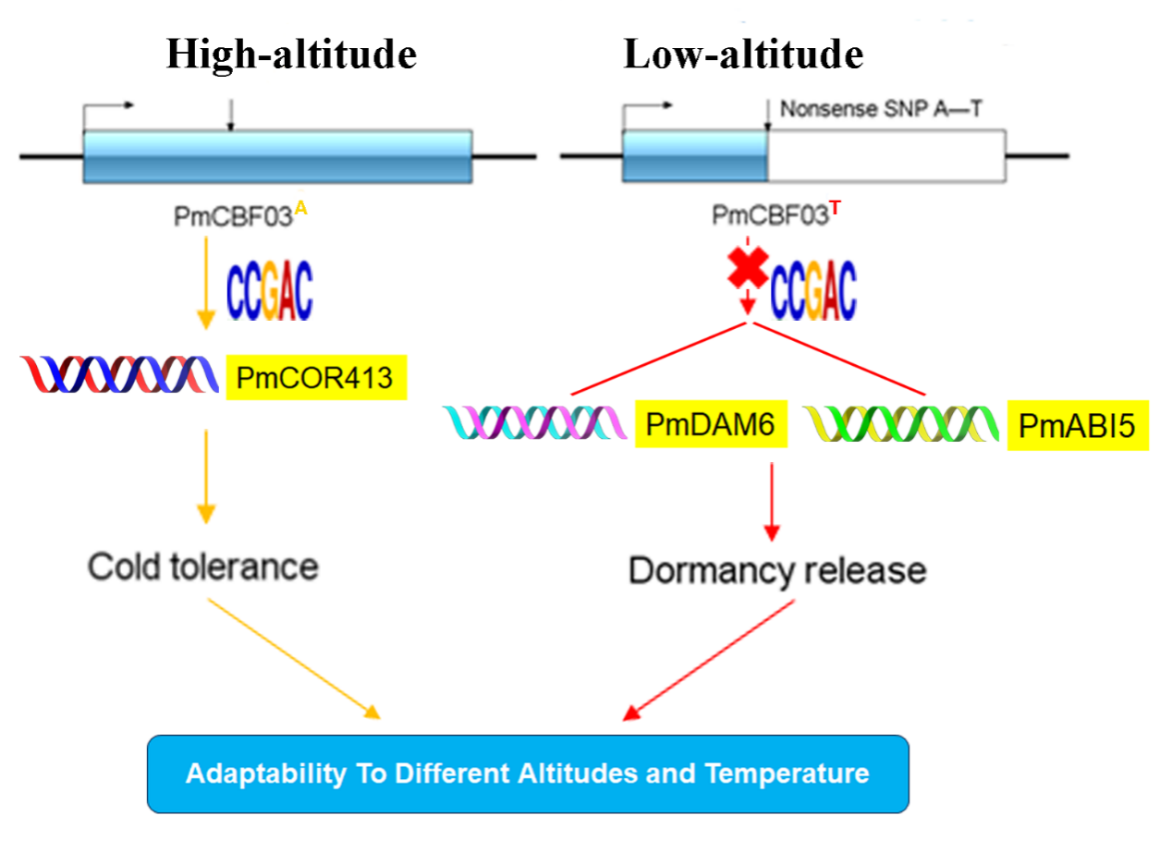 该研究首先对不同海拔地区的梅群体样品进行了选择性清除分析,在第7号染色体上,鉴定了一个高度受到选择的区域,LG07-LD1(8.04-8.14Mb),LD连锁分析也显示该区域具有非常高的连锁强度。在该区域进一步分析发现低温响应转录因子PmCBF03被强烈选择,该基因在外显子区域存在一个早期终止SNP突变,在不同海拔的种群中表现出PmCBF03A和PmCBF03T两种不同的变异类型。转基因和生理生化试验表明PmCBF03A基因提高了转基因拟南芥在低温和冷冻胁迫下的存活率、抗氧化酶活性和抗氧化酶基因的表达水平,减少了电解质的渗漏和ROS的积累,提高了转基因株系的抗寒性。同时,与野生型相比,PmCBF03A基因促进了转基因拟南芥种子的休眠。进一步通过酵母单杂、双荧光素酶、EMSA等分子试验表明,PmCBF03A可以直接与PmCOR413、PmDAM6和PmABI5基因启动子中的DRE/CRT元件结合,促进了它们的转录,增强了过表达PmCBF03A株系的抗寒性和促进休眠。而PmCBF03T基因无法与PmDAM6和PmABI5基因的启动子结合,导致休眠提前解除,以适应低海拔地区梅的需冷量不足的问题(图1)。