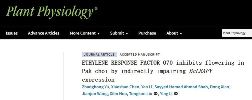 白菜系统生物学实验室在Plant Physiology杂志发表了题为“ETHYLENE RESPONSE FACTOR 070 inhibits flowering in Pak-choi by indirectly impairing BcLEAFY expression”的研究论文。该研究解析了乙烯响应因子BcERF070抑制不结球白菜开花的分子机制。