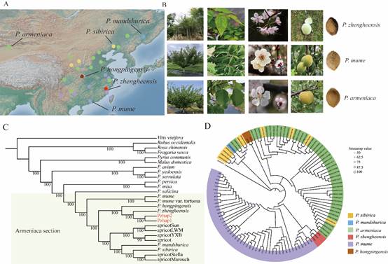 政和杏(Prunus zhengheensis)是蔷薇科李属杏组多年生木本植物。于1996年在福建省南平市政和县首次发现,是我国珍稀濒危植物,已被列入《世界自然保护联盟濒危物种红色名录》。其树形高大,花量繁多,色彩艳丽,果实可以药食两用,且耐高温湿热环境,张加延教授基于政和杏的形态分类将其定为杏组新种。梅和杏为近缘种,素有南梅北杏的说法,梅适宜生长在高温多湿的亚热带地区而杏主要分布于冷凉的温带地区,而政和杏分布在福建和浙江,这打破了人们对杏地理分布的认知。因此,政和杏为研究杏和梅不同生态适应性提供了天然植物材料。