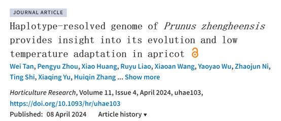 等单位合作完成的题为Haplotype-resolved genome of Prunus zhengheensis provides insight into its evolution and low temperature adaptation in apricot 的研究论文,主要报道了政和杏染色体级别的单倍型基因组基因组组装结果,并进行了杏低温适应性研究。