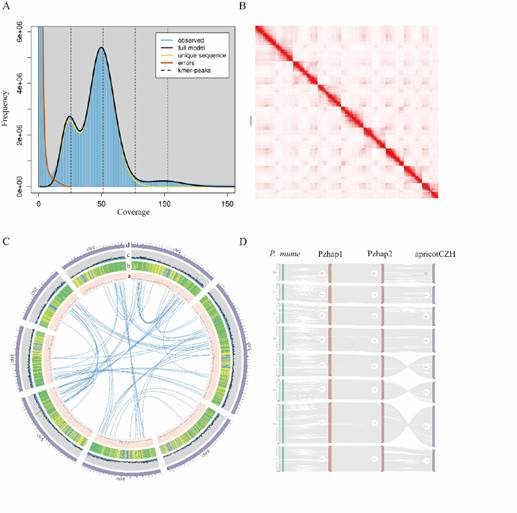 Fig. 1. 政和杏基因组特征并与近缘种共线性分析