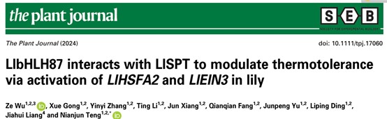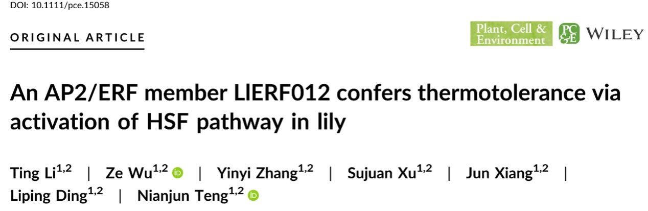 滕年军教授团队分别在The Plant Journal和Plant, Cell and Environment发表了题为“LlbHLH87 interacts with LlSPT to modulate thermotolerance via activation of LlHSFA2 and LlEIN3 in lily”和“An AP2/ERF member LlERF012 confers thermotolerance via activation of HSF pathway in lily”系列研究论文,揭示了bHLH类转录因子LlbHLH87和LlSPT互作拮抗调控百合耐热性的新机制,以及AP2/ERF转录因子LlERF012协同热激转录因子参与百合耐热性建立的新机制。