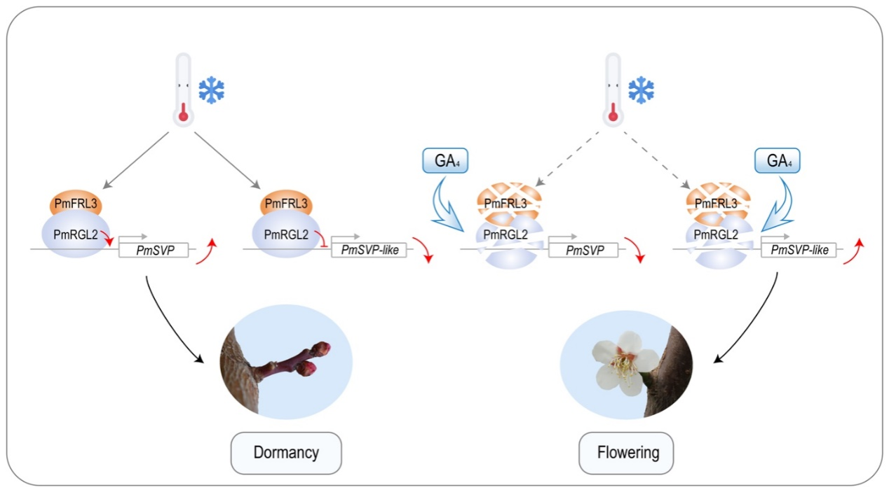 作者提出了一个GA和低温对梅开花的调节模型。在冬季低温下,大量的PmFRL3蛋白与PmRGL2蛋白形成复合物,保持其稳定性。这种PmRGL2/PmFRL3蛋白复合物促进PmSVP表达并抑制PmSVP-like的表达,以维持梅休眠状态。当需冷量足够时,PmFRL3蛋白降解,破坏PmRGL2/PmFRL3蛋白复合物,导致PmRGL2蛋白响应GA信号传导而降解。此时,PmSVP-like功能被释放,并主导梅开花。本研究为阐明低温和赤霉素途径主导的梅休眠和开花分子调控机制提供了新的视角。