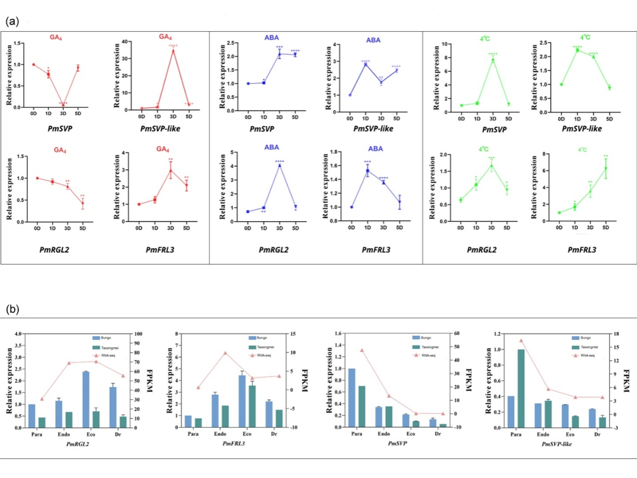 高志红教授团队针对这一问题在植物科学领域经典期刊Plant, Cell & Environment(中科院一区TOP期刊,5年影响因子7.6)上发表题为“PmRGL2/PmFRL3–PmSVP Module Regulates Flowering Time in Japanese apricot (Prunus mume Sieb. et Zucc.)”的研究论文。该研究阐明了PmRGL2/PmFRL3蛋白复合体响应GA信号和低温积累并通过PmSVP和PmSVP-like调控梅开花时间,为全面揭示木本植物季节性休眠解除与花开放时间的关联分子机制提供了新的思路。