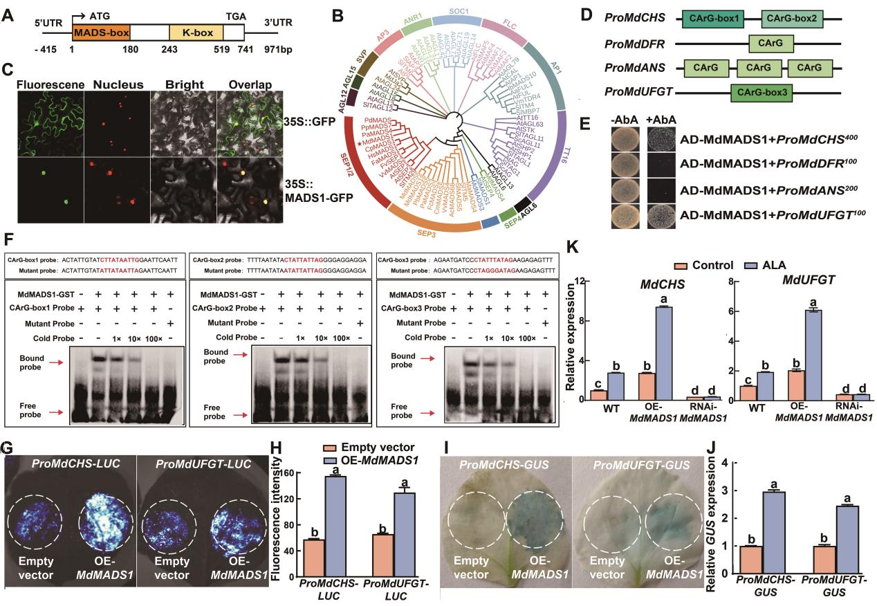首先利用外源ALA处理、GUS、LUC报告基因、酵母单杂交、EMSA以及过表达和抑制表达体系证明,ALA诱导离体苹果果皮、叶片及愈伤组织花青苷合成过程中依赖于MdMADS1(图1),而MdMADS1作为转录因子能够结合并激活MdCHS及MdUFGT表达(图2),从而促进花青苷合成。