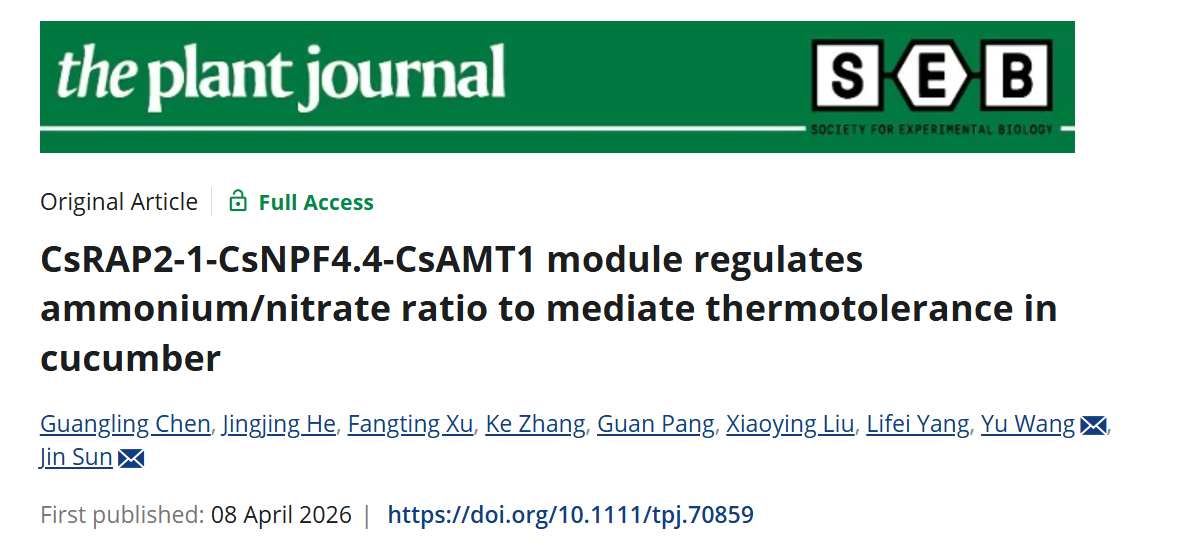 设施园艺团队在国际植物学期刊《The Plant Journal》在线发表题为“CsRAP2-1-CsNPF4.4-CsAMT1 module regulates ammonium/nitrate ratio to mediate thermotolerance in cucumber”的研究论文,系统揭示了CsRAP2-1-CsNPF4.4-CsAMT1模块调控NH₄⁺/NO₃⁻比例增强黄瓜(Cucumis sativusL.)耐热性的分子机制。