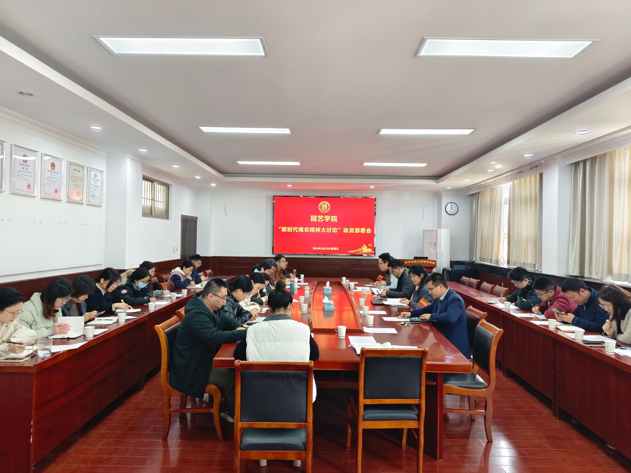 3月15日上午,区块链游戏 在生科楼B4003召开新学期党委扩大会暨“新时代南农精神大讨论”工作动员部署会,全体院领导、党委委员、党支部书记参加了会议。会议由石木舟副书记主持。